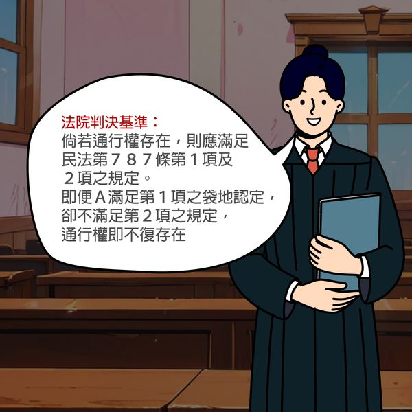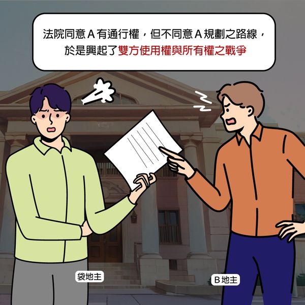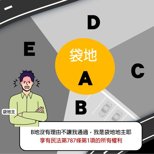 →劇情往下發展,A向法院提告經法院准其通行B地至甲路,於此,便興起了「鄰地所有人與袋地使用人之戰爭」