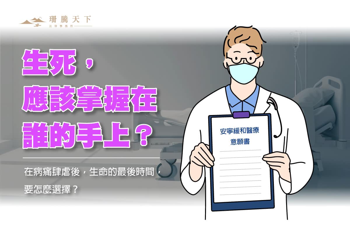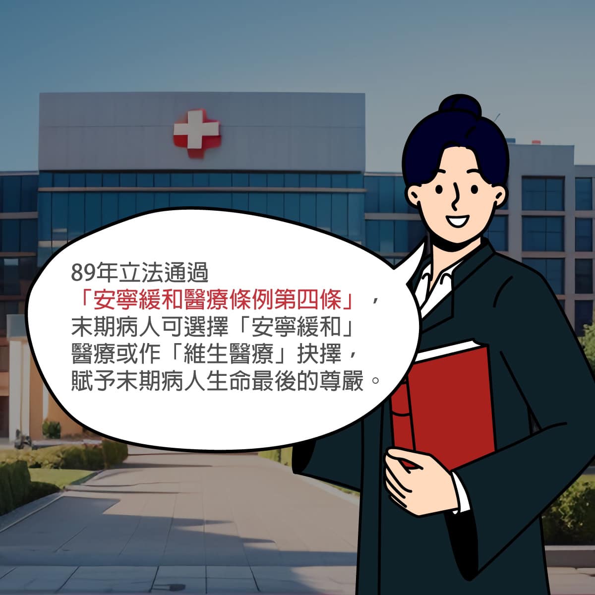 除了因自然老化或意外發生,使生命走到終點之外,在生命臨終前夕,病痛纏身,在苦痛中垂死掙扎直至嚥氣的人數不勝數,為了維護病患最後的尊嚴,也為賦予他們決定自己生命最後態樣的走向權利,台灣於民國89年立法通過「安寧緩和醫療條例」,賦予末期病人得預立意願書,主張若於生命末期時可選擇「安寧緩和」醫療或作「維生醫療」抉擇。譯文:末期病人:末期病人指罹患嚴重傷病,經醫師診斷認為不可治癒,且有醫學上之證據,近期內病程進行至死亡已不可避免者/安寧緩和醫療條例第3條第2款