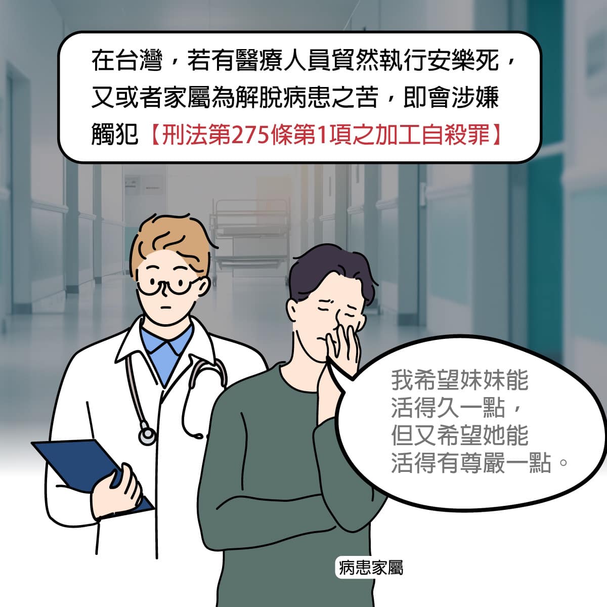 而常與安寧緩和醫療放在一起討論的醫療措施,還有「安樂死」以及「協助自殺」兩種,但此兩種醫療措施《在台灣皆為不法》,如實施將會構成【刑法第275條加工自殺罪】,且與安寧緩和醫療有著不小的差別。